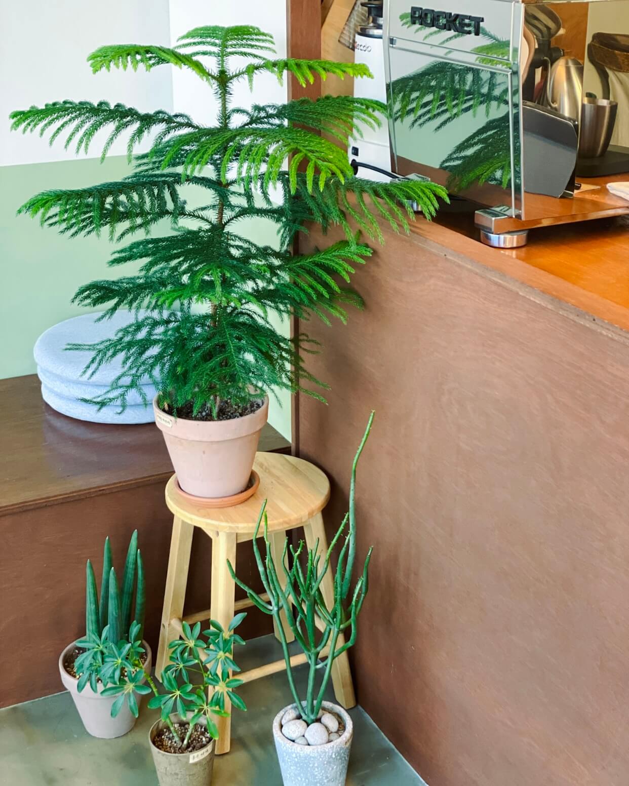 카페 문을 열고 들어오면 옅은 아이보리색인가?, 파스텔 올리브색? 색을 잘 매칭시킨 것 같은 벽, 나무로 인테리어가 되어있고 크고 작은 식물도 같이 숨 쉬는 공간이 편안한 느낌이 들었습니다.