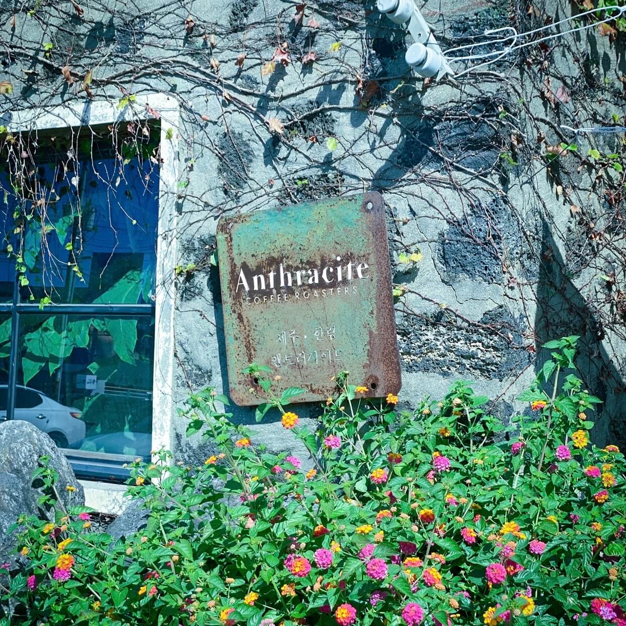 잠깐 앤트러사이트 한림점을 소개해 드리면 간판부터 낡은 느낌으로 시작하여 제주도 돌로 지은 외벽과 공장 느낌의 분위기가 살아있는 외부 조경엔 바람이 불면 하늘거리며 흔들리는 털 수염풀과 다양항 식물들로 인해 분위기가 좋고 비가 와도 외부에 앉을 수 있게 의자와 구경할 수 있는 공간, 화장실(외부입구)로 연결된 문도 있습니다.
